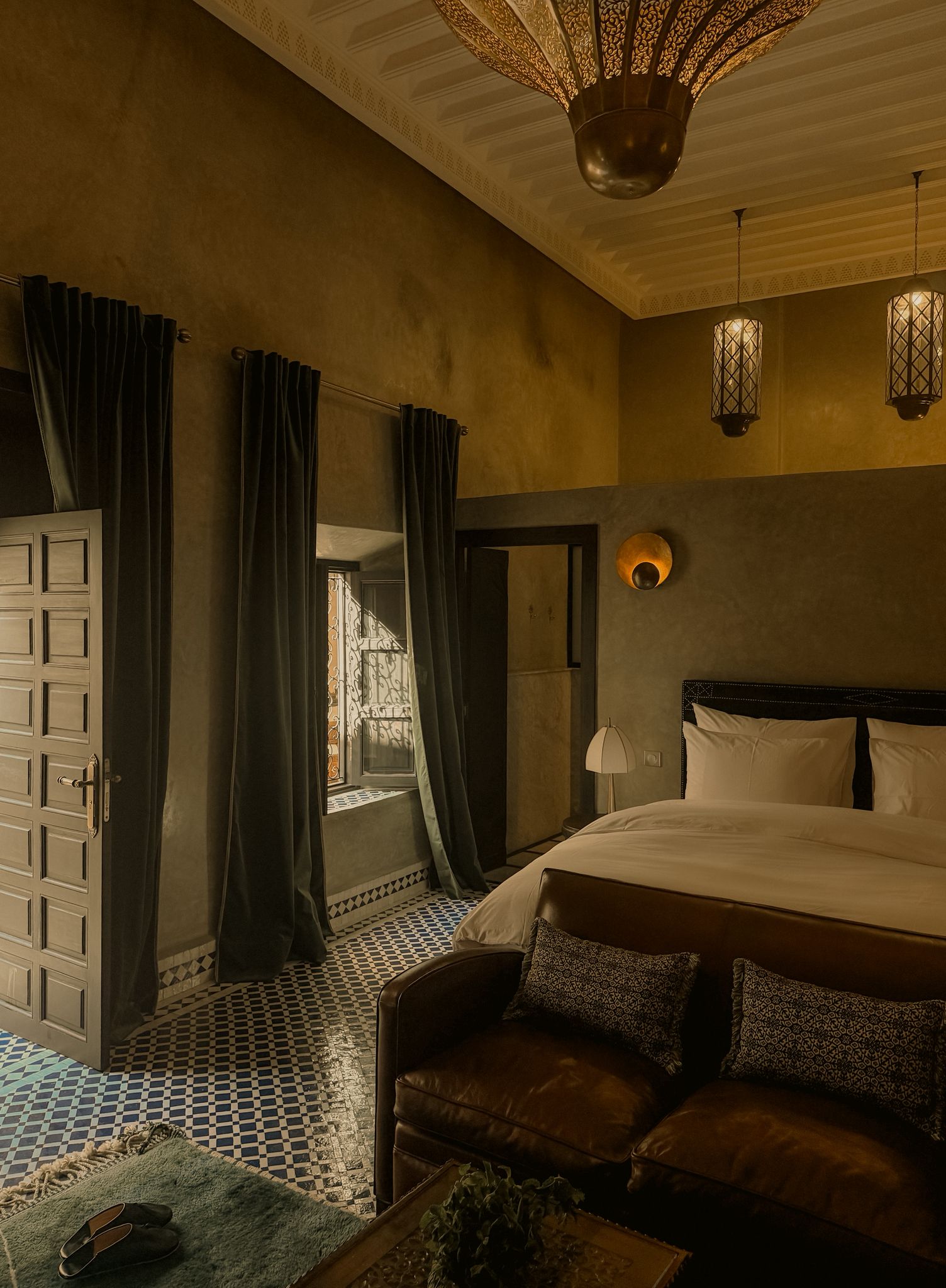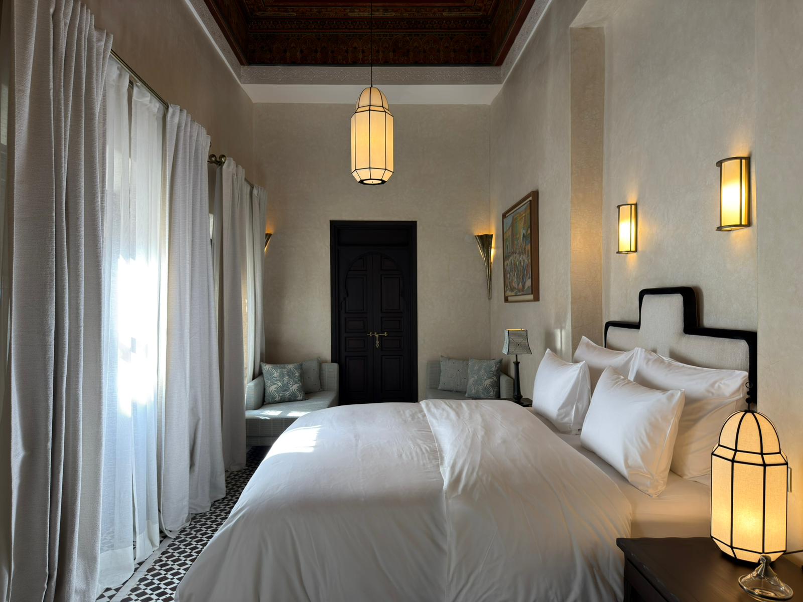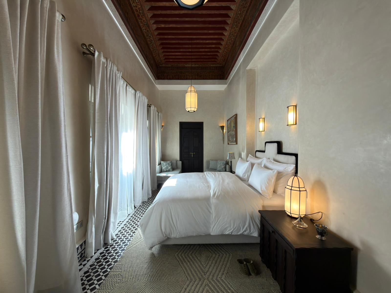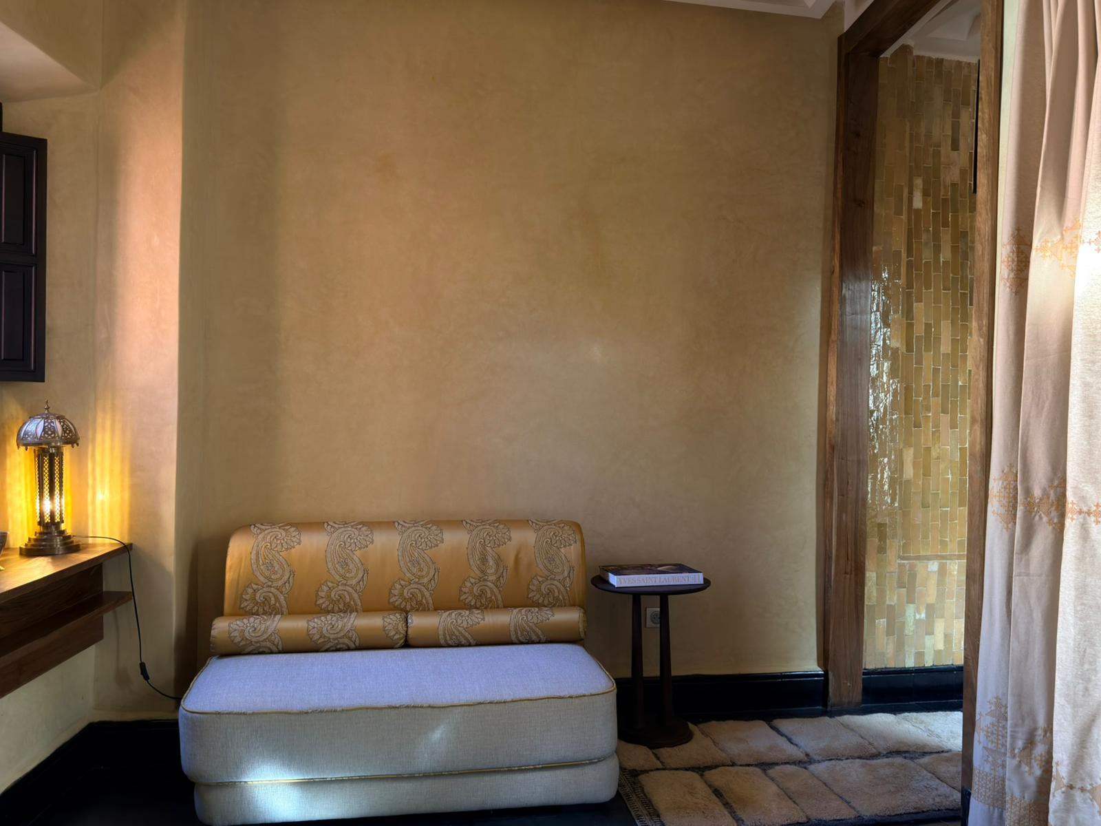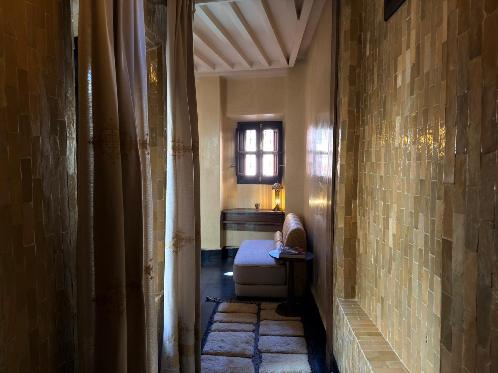 Le sue alte finestre, vestite di leggeri veli, diffondono una luce soffusa che dialoga con le lanterne e con le pareti dai toni delicati. Il soffitto antico e maestoso richiama la storia del riad, mentre le sedute confortevoli invitano al relax.