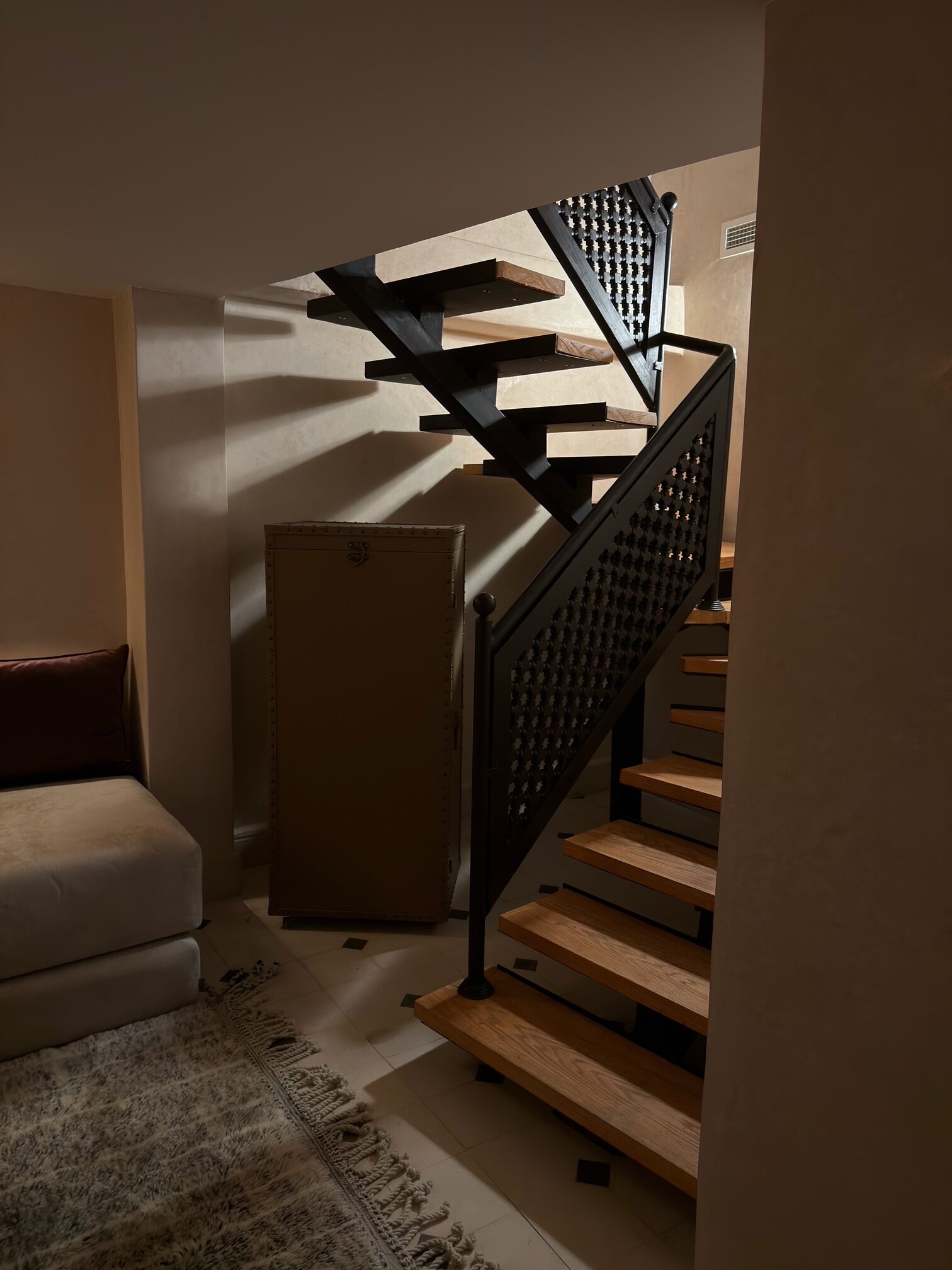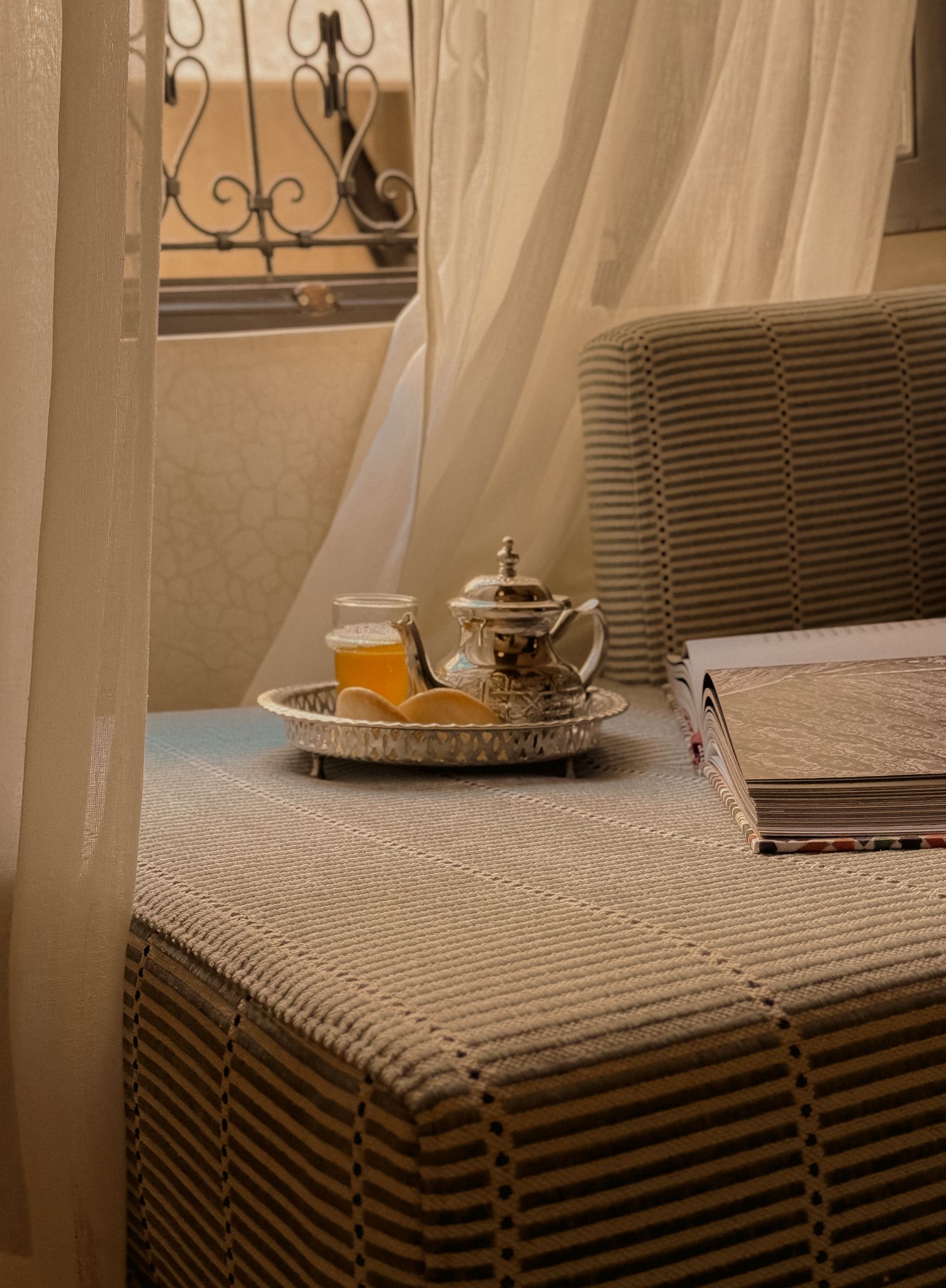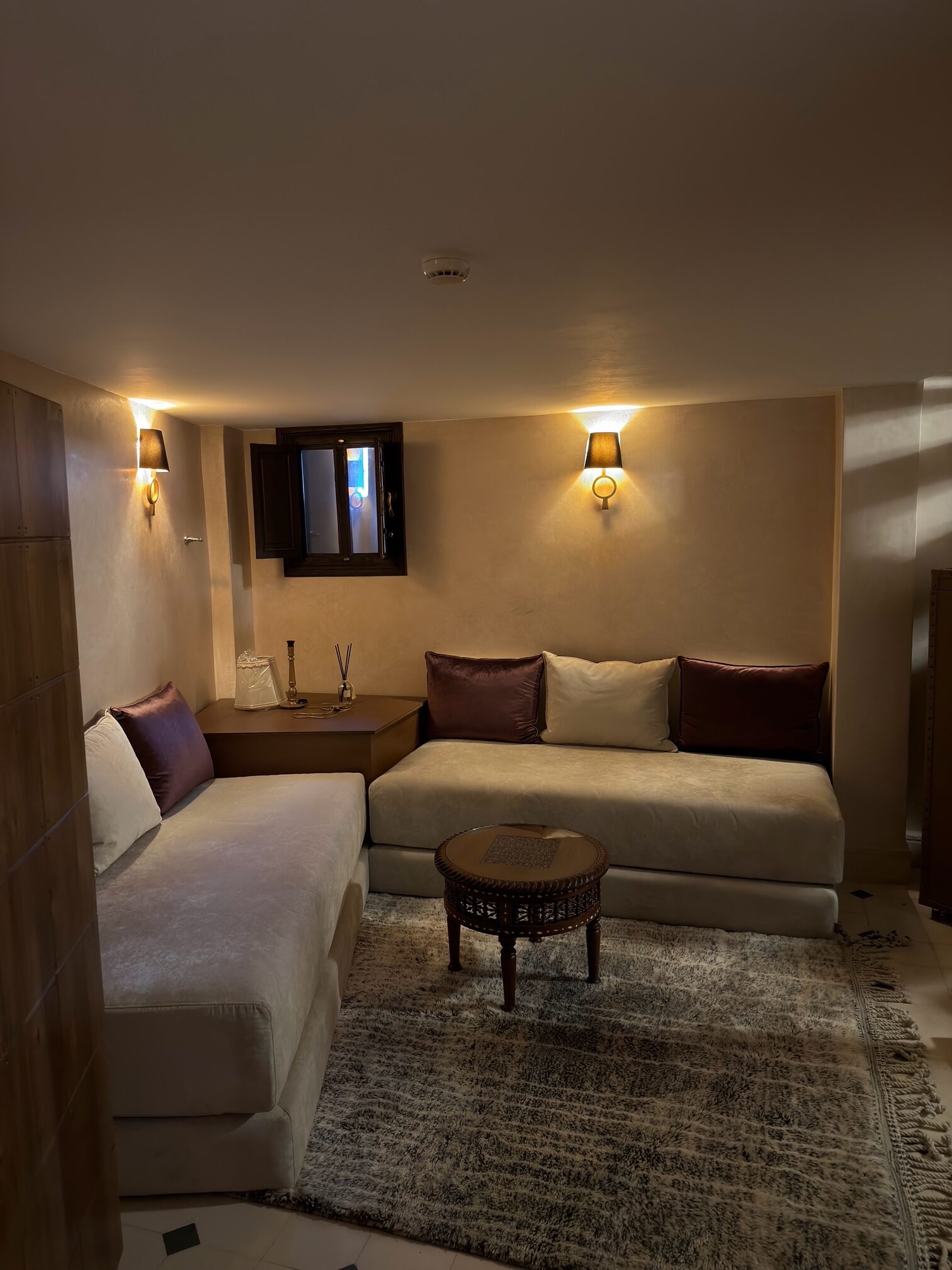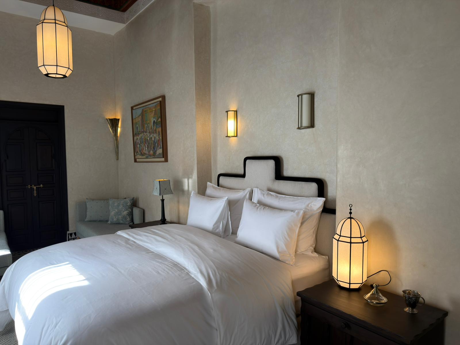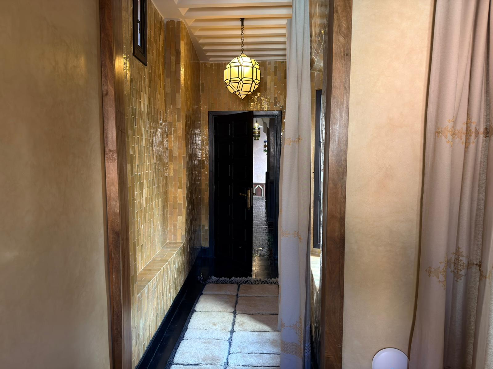 Le sue alte finestre, vestite di leggeri veli, diffondono una luce soffusa che dialoga con le lanterne e con le pareti dai toni delicati. Il soffitto antico e maestoso richiama la storia del riad, mentre le sedute confortevoli invitano al relax.