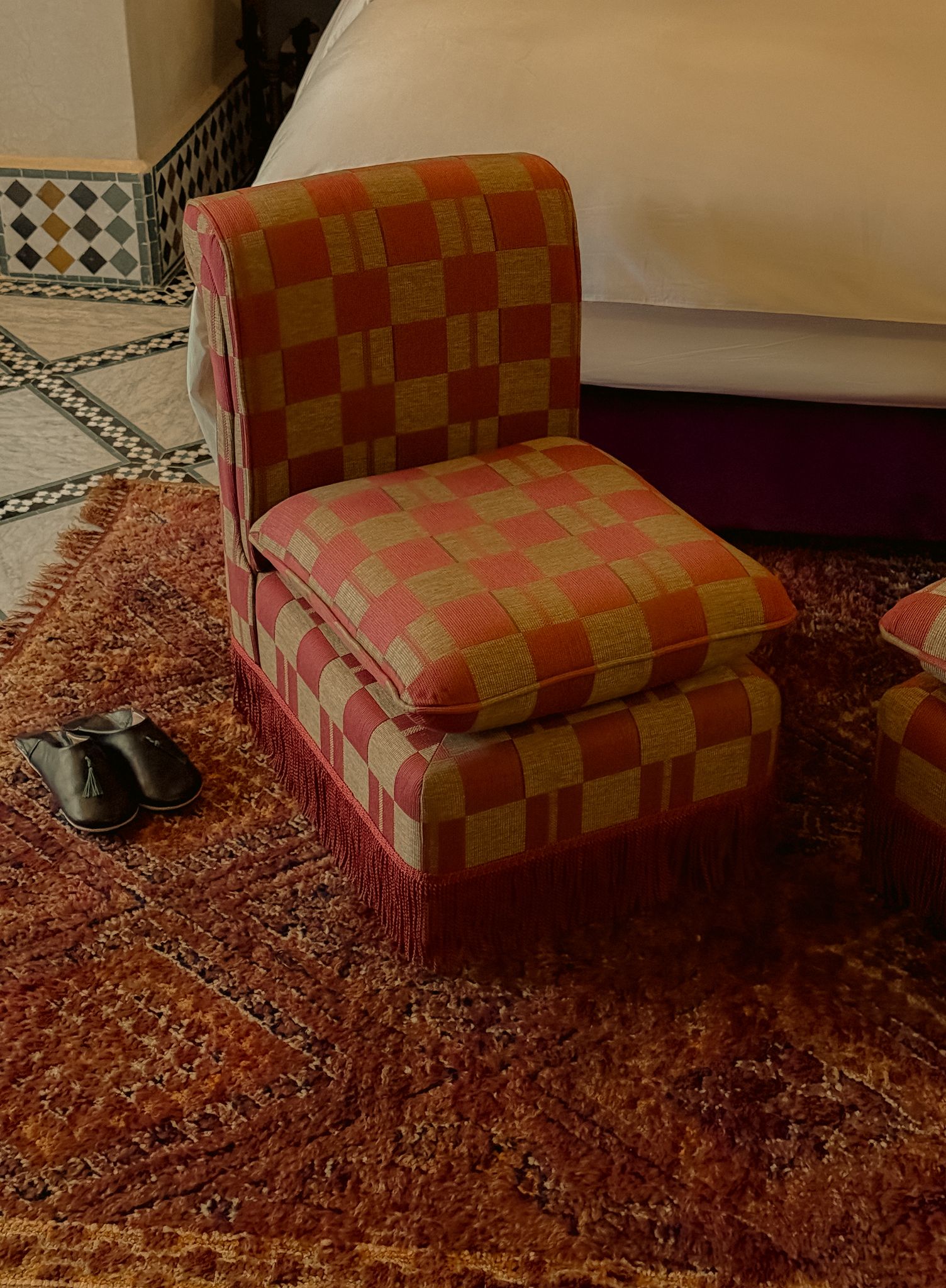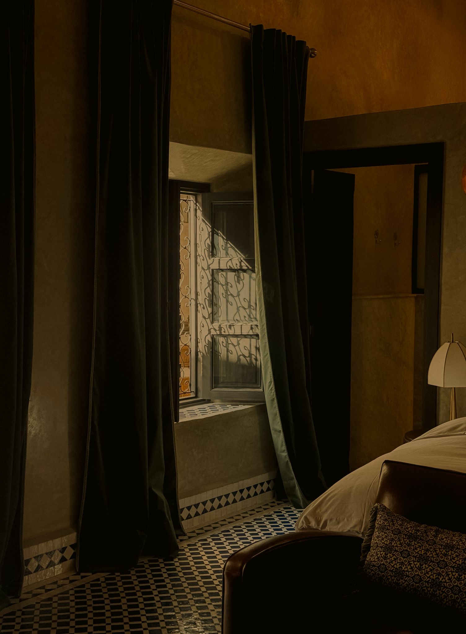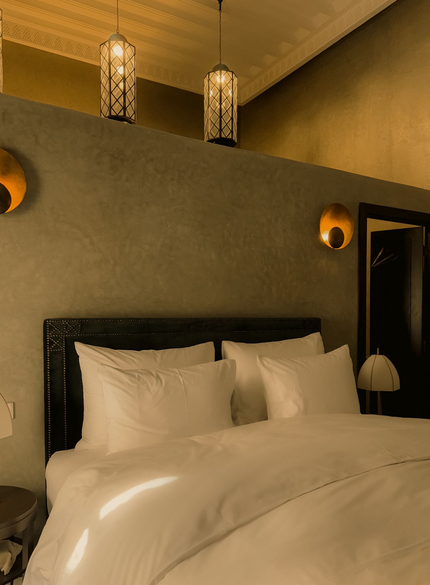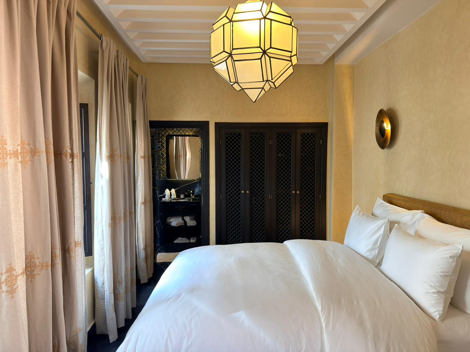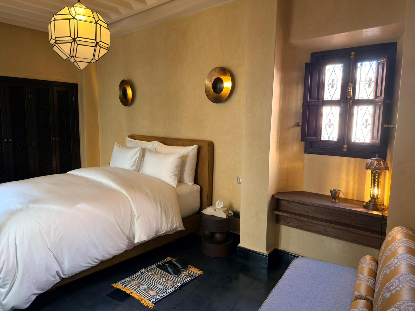Sfar irradia come un raggio di sole. Le sue pareti rivestite di zellige, i ricami delicati e le materie setose si fondono con una luce generosa che inonda la camera attraverso le sue numerose finestre.