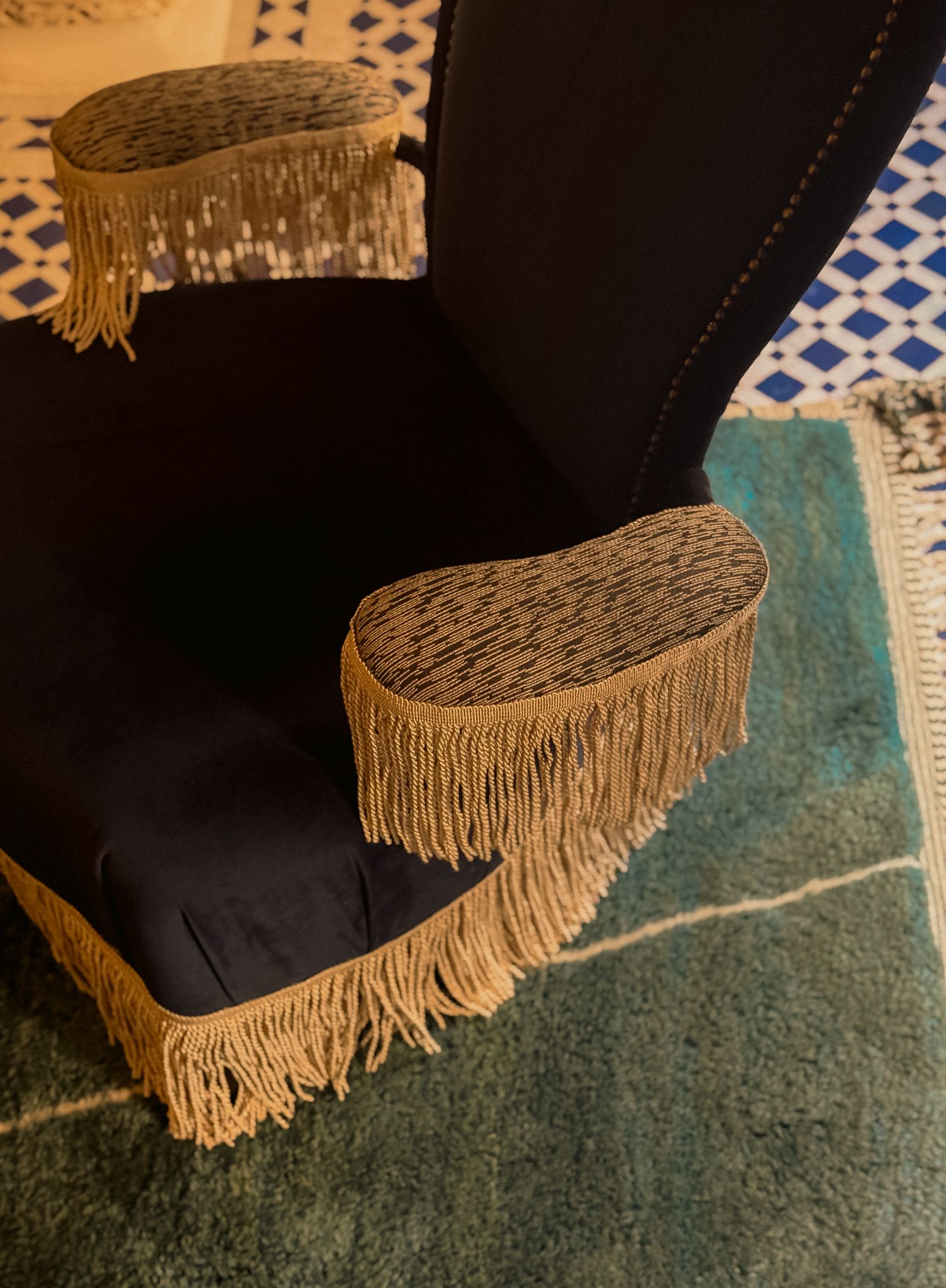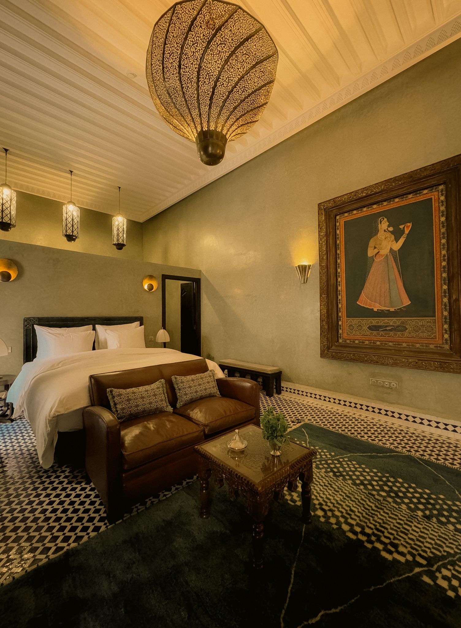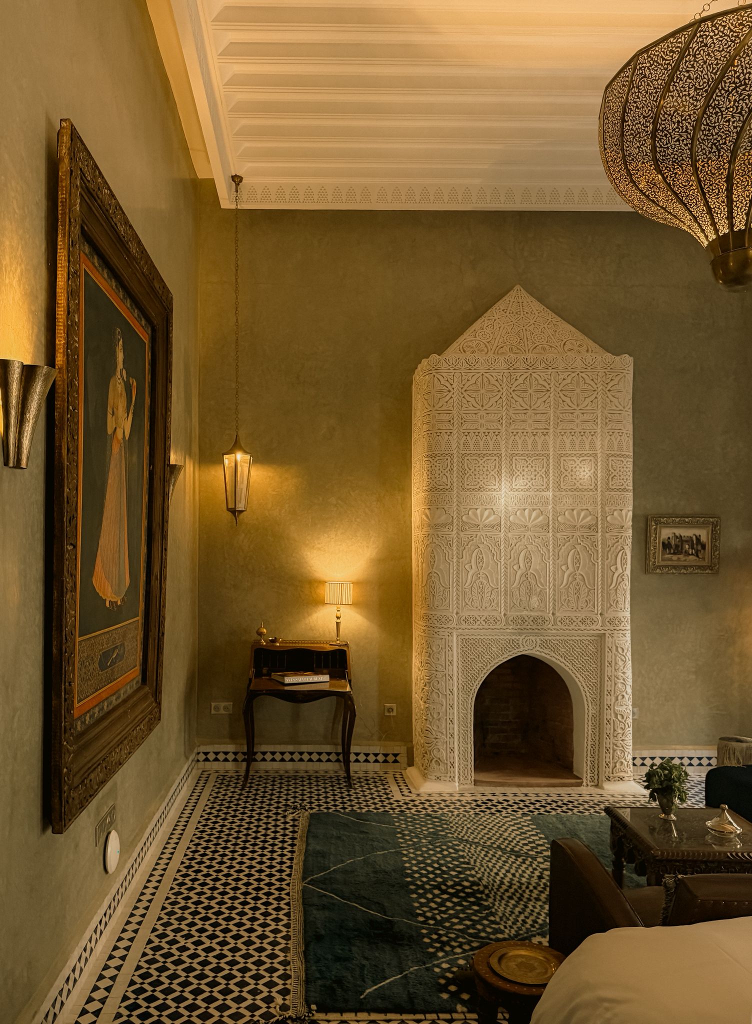 Dafia, “la calorosa”, porta perfettamente il suo nome. Qui la luce si fa discreta per rivelare meglio la profondità dei verdi e dei blu, come un abbraccio rassicurante. La camera si articola attorno a un antico camino in stucco, restaurato da un maestro artigiano, vero cuore pulsante dello spazio. Il pavimento in zellige blu e bianchi dialoga con un tappeto moderno, che sembra quasi tessuto per fondersi con questa armonia.