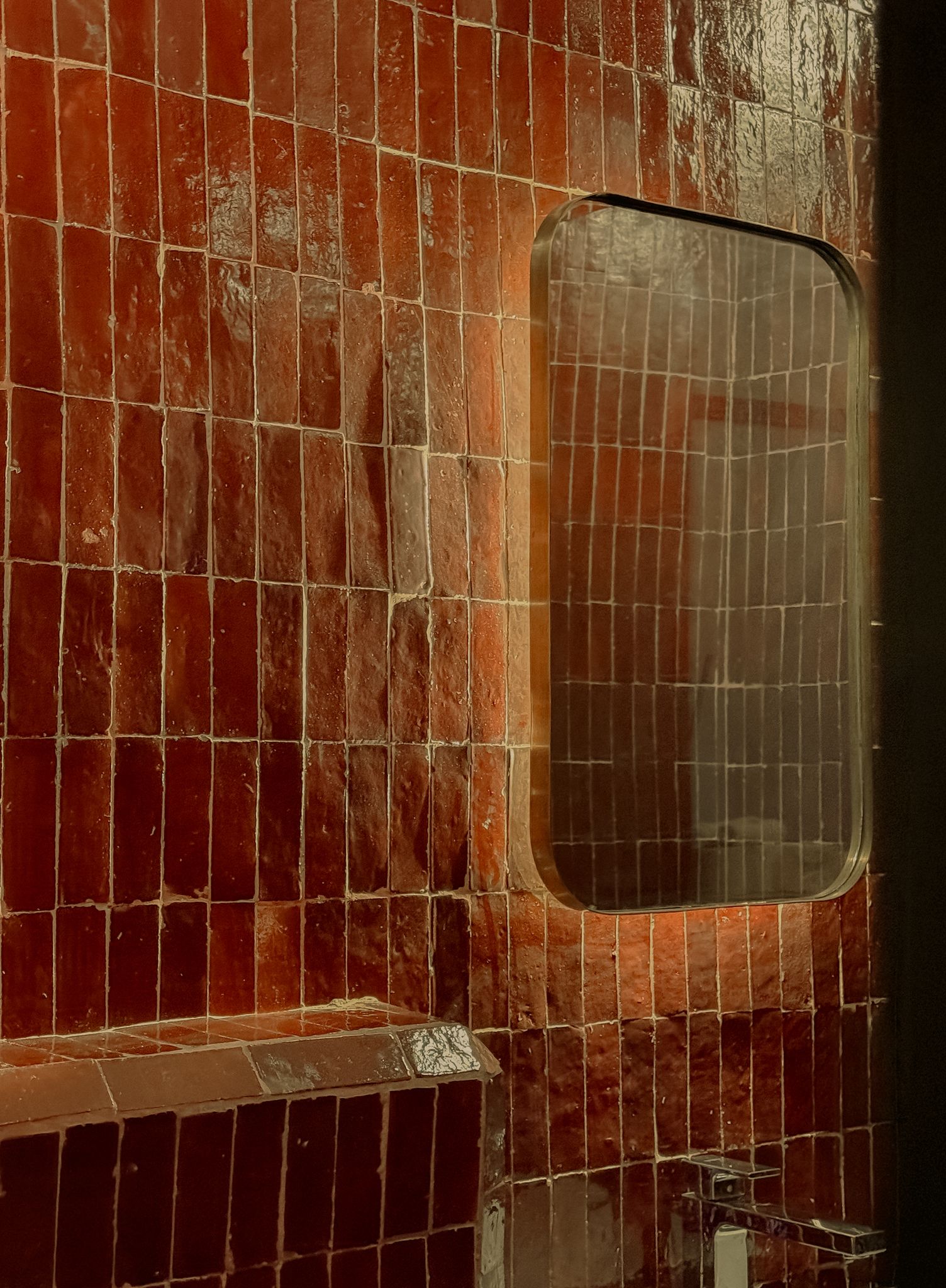 Amra è un intimo rifugio, avvolto da un profondo rosso bordeaux che si rivela in tocchi raffinati negli zellige e fino alla sala da bagno.